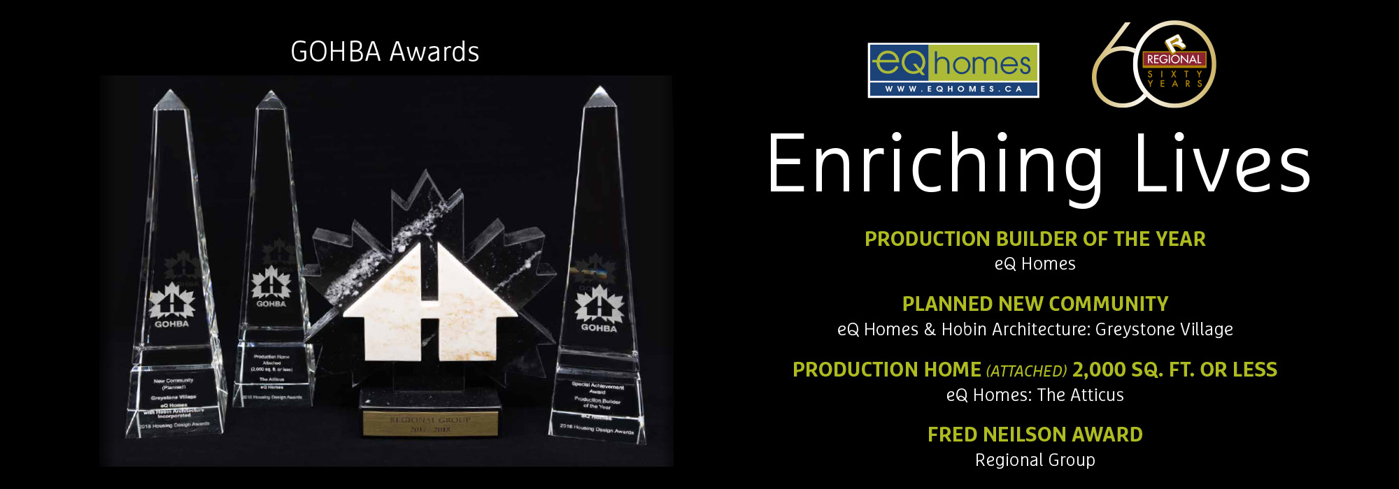 With more than five hundred people in attendance, eQ Homes was honoured with the coveted Special Achievement Award: Production Builder of the Year, as well as the Production Home Award: Attached (2,000 sq. ft. or less) for The Atticus, and the New Community (Planned) Award for Greystone Village.